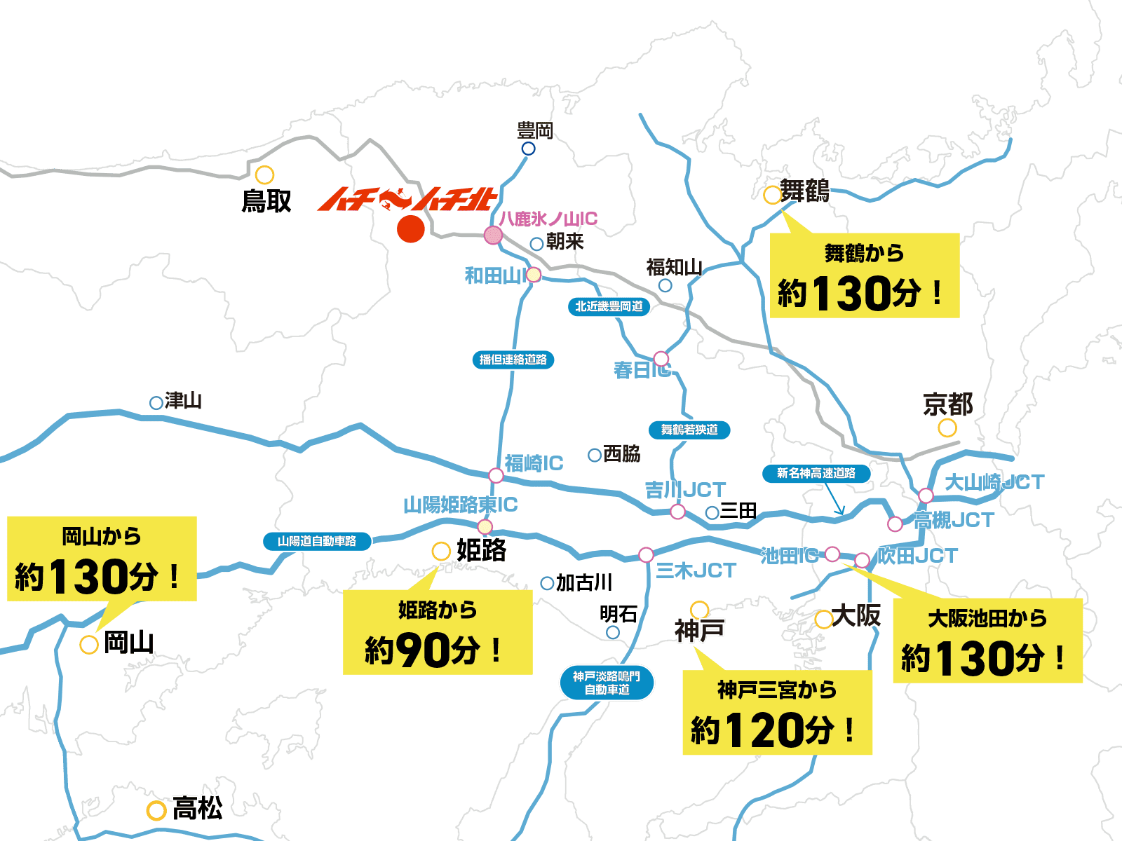 Great access not only from Himeji, Akashi, Kakogawa, but also from Keihanshin!Moreover, there are many free sections of the expressway (Kita Kinki Toyooka Expressway), which is a great deal!
